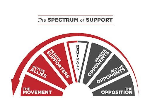 It shows that movements rarely win by overpowering the ‘opposition’. They win by shifting support away from it. The goal is not ‘converting’ everyone, but moving each group one step closer.